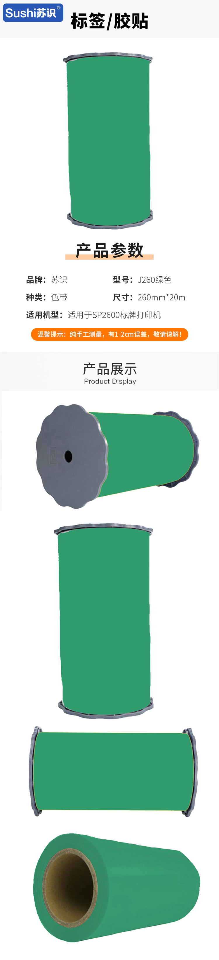苏识 J260 胶贴 260mm*20m 适用SP2600标牌打印机 绿色(单位:盒)