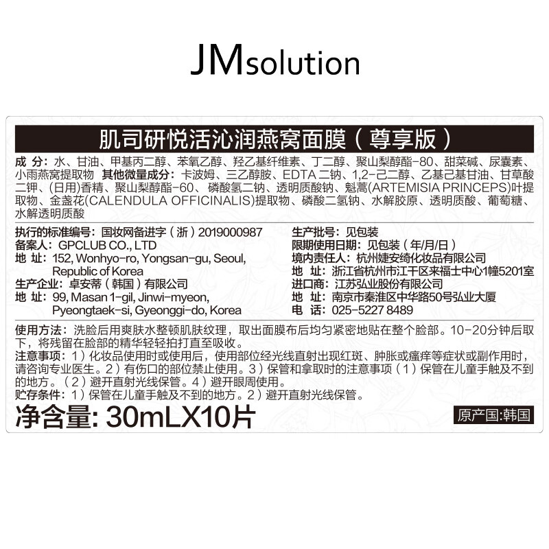 肌司研(JMsolution) 悦活沁润 燕窝面膜 30ml/片 10片/盒(单位:盒)