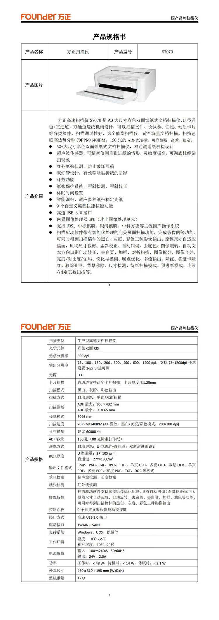 方正(Founder) S7070 彩色双面馈纸式扫描仪 70PPM 140IPM (单位:台)